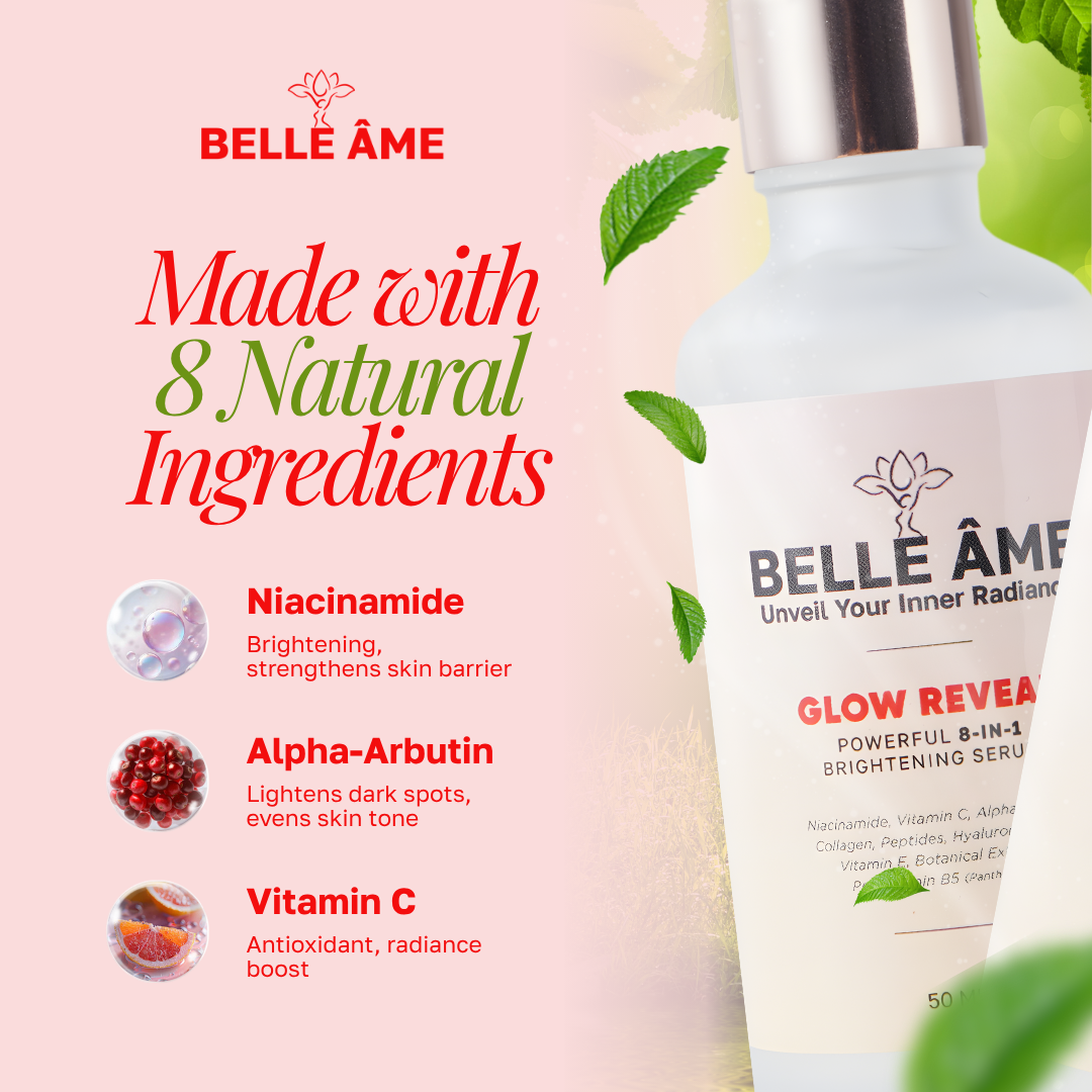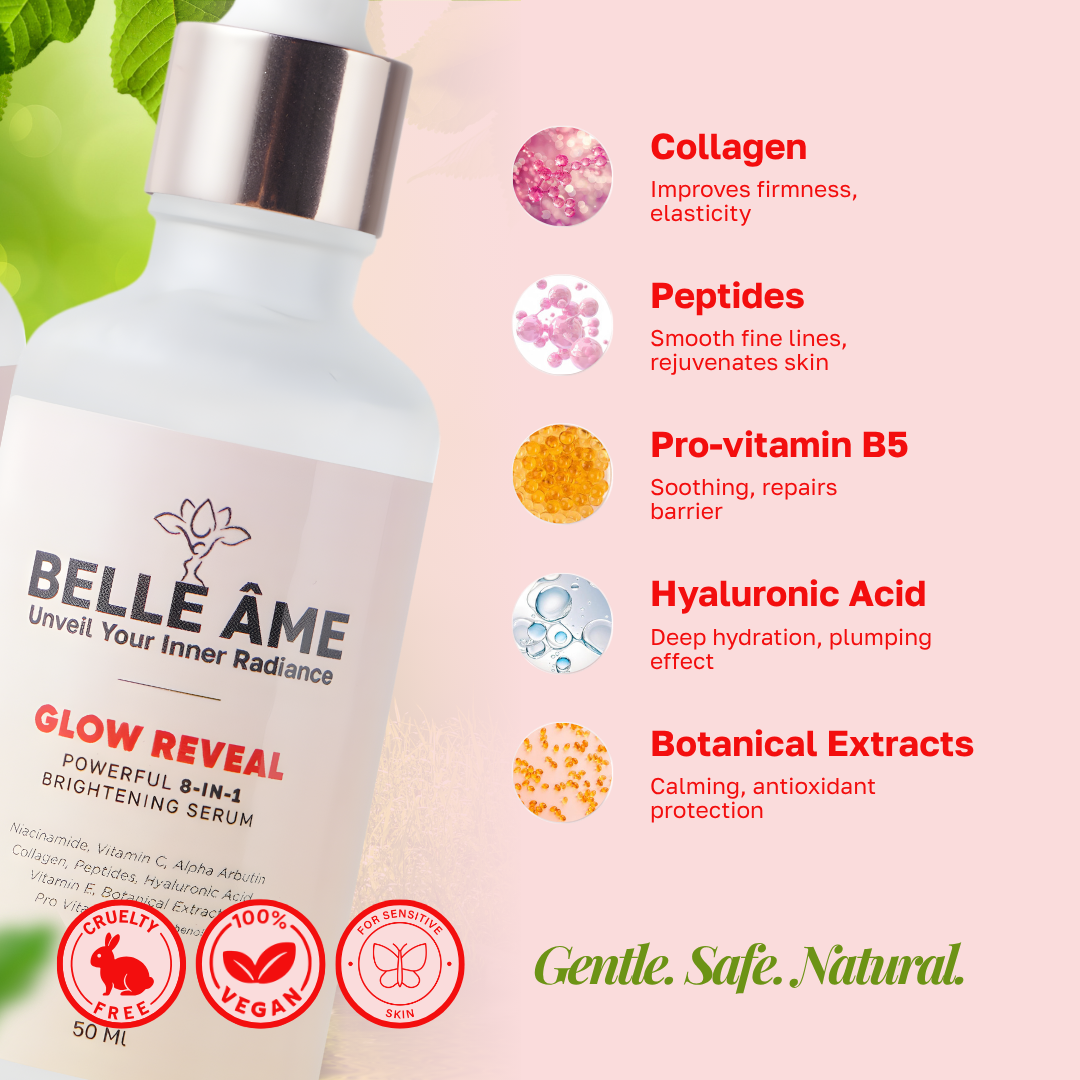 This multi-action serum is designed to simplify your routine while addressing eight key skin concerns in one elegant step. Powered by a blend of brightening actives, hydrating essentials, and rejuvenating peptides, Glow Reveal helps restore balance, clarity, and resilience for skin that glows from within.